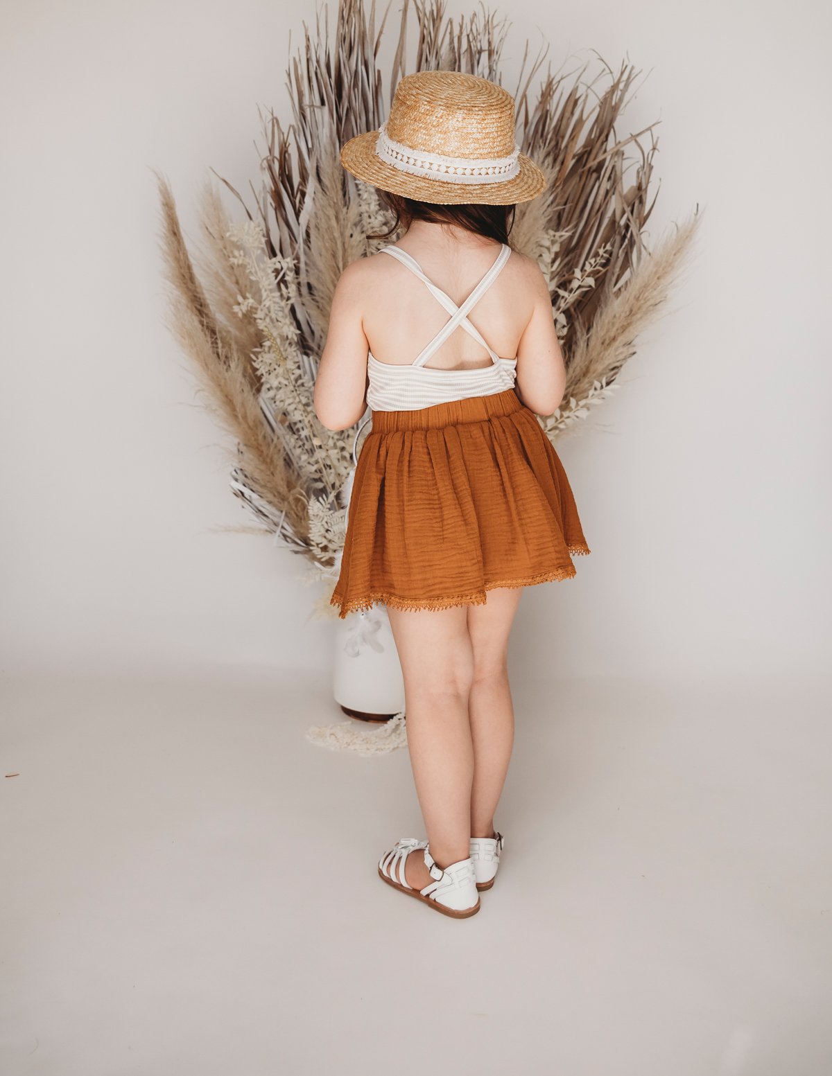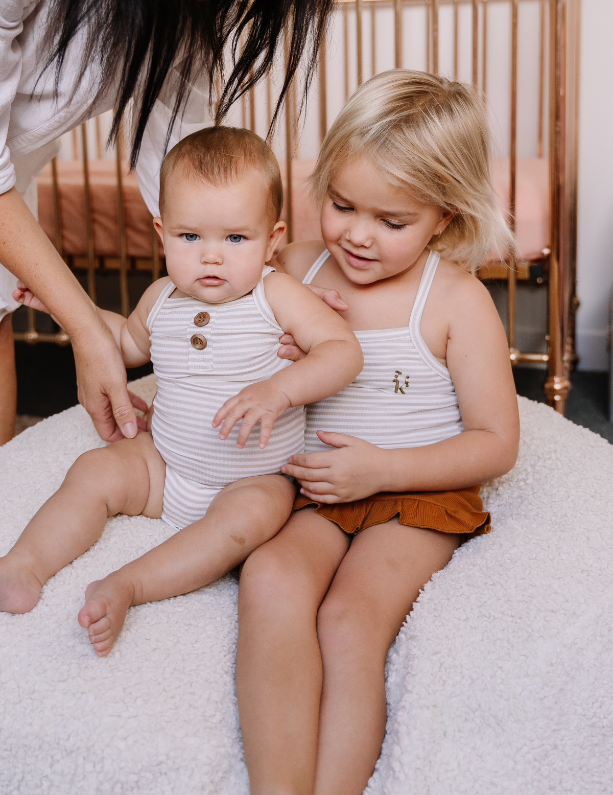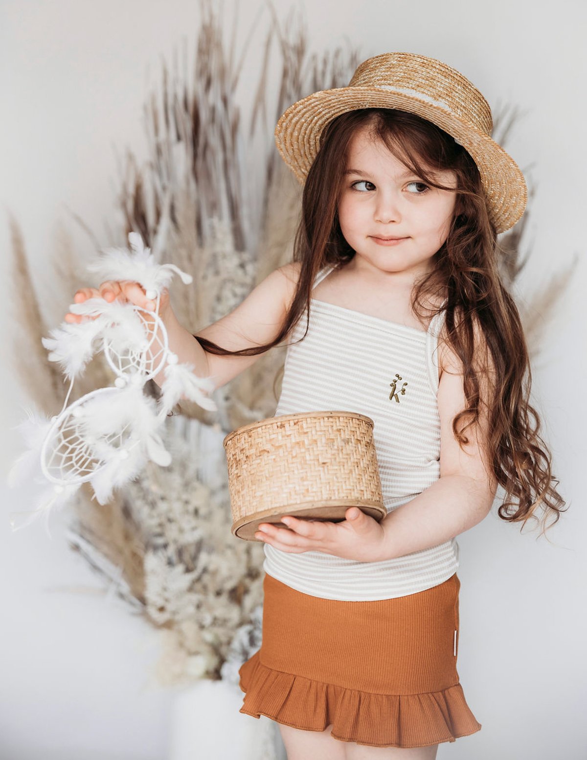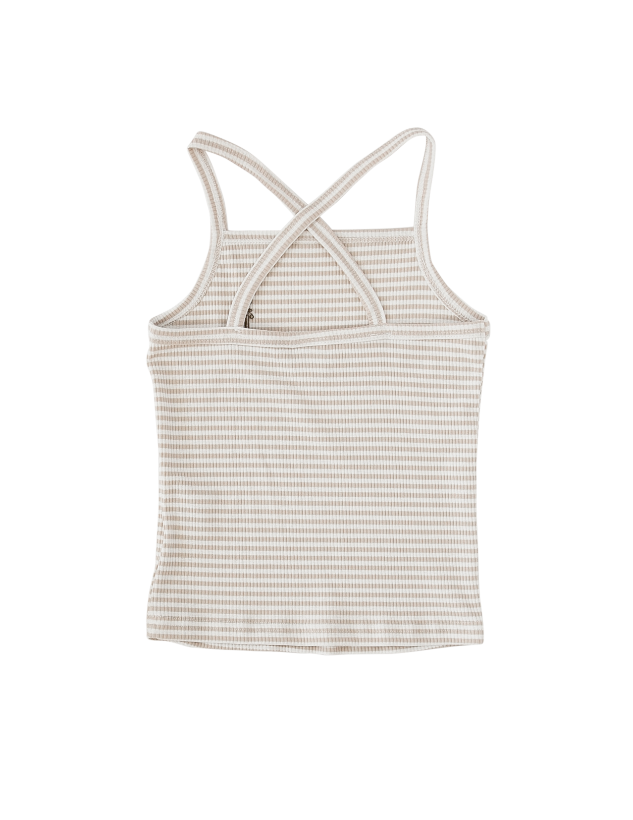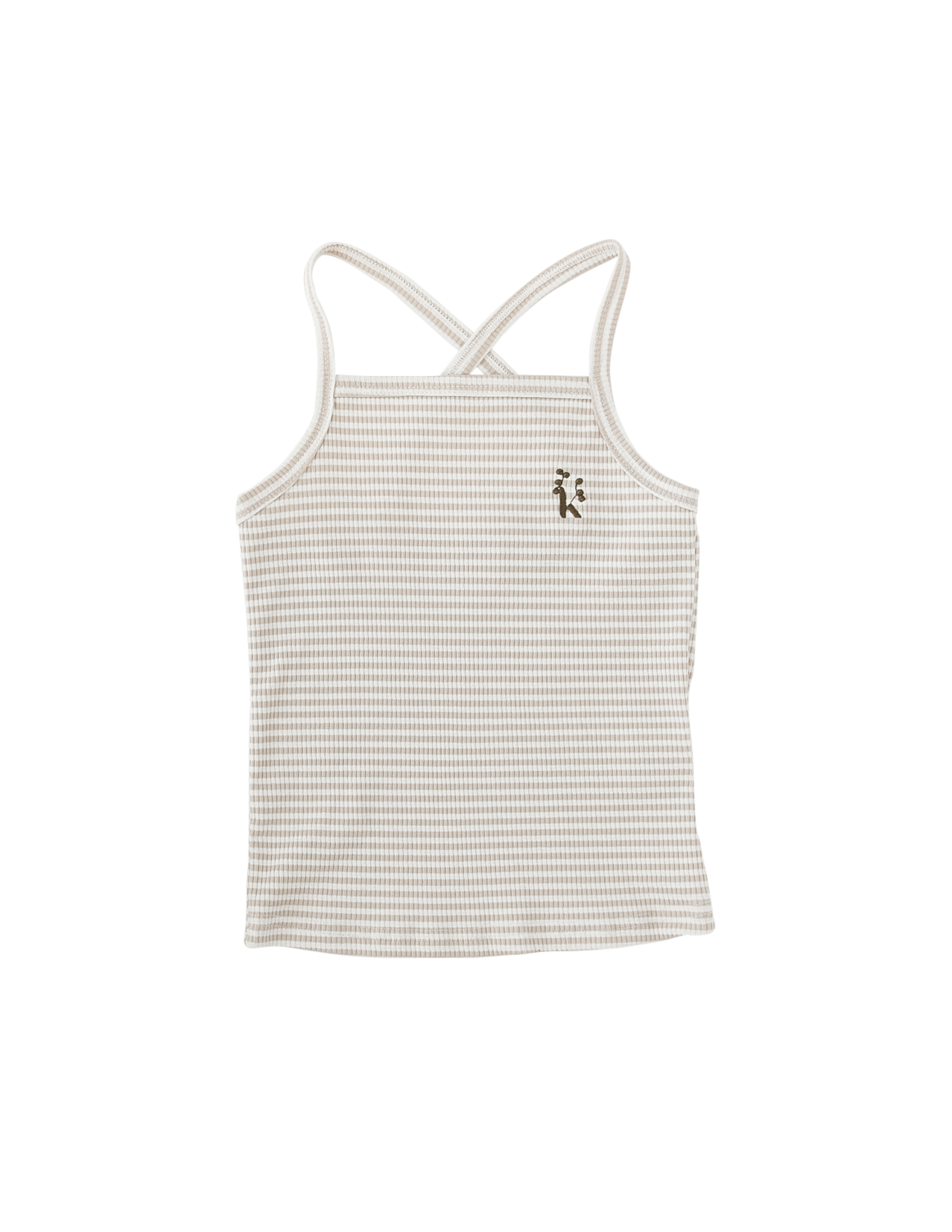 Inspired by sunny seaside days, the Paloma Singlet is perfect for beach trips, picnics, or any summer outing. Made from a soft ribbed cotton blend, it features a cozy texture and a timeless striped pattern in natural beige.