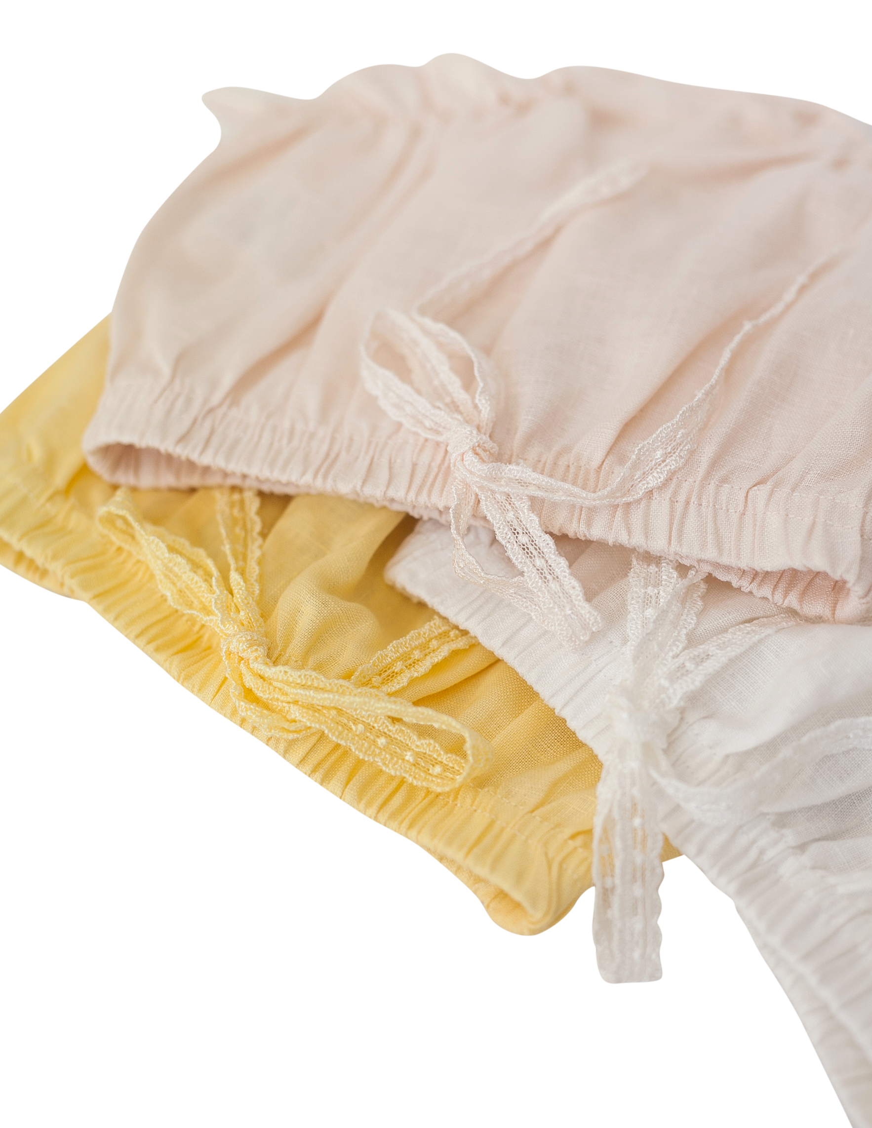 Our Ella bloomers are available in three different shades. The Cookie Dough and Lemon Meringue bloomers are designed for matching and pairing with our Luna linen dresses.