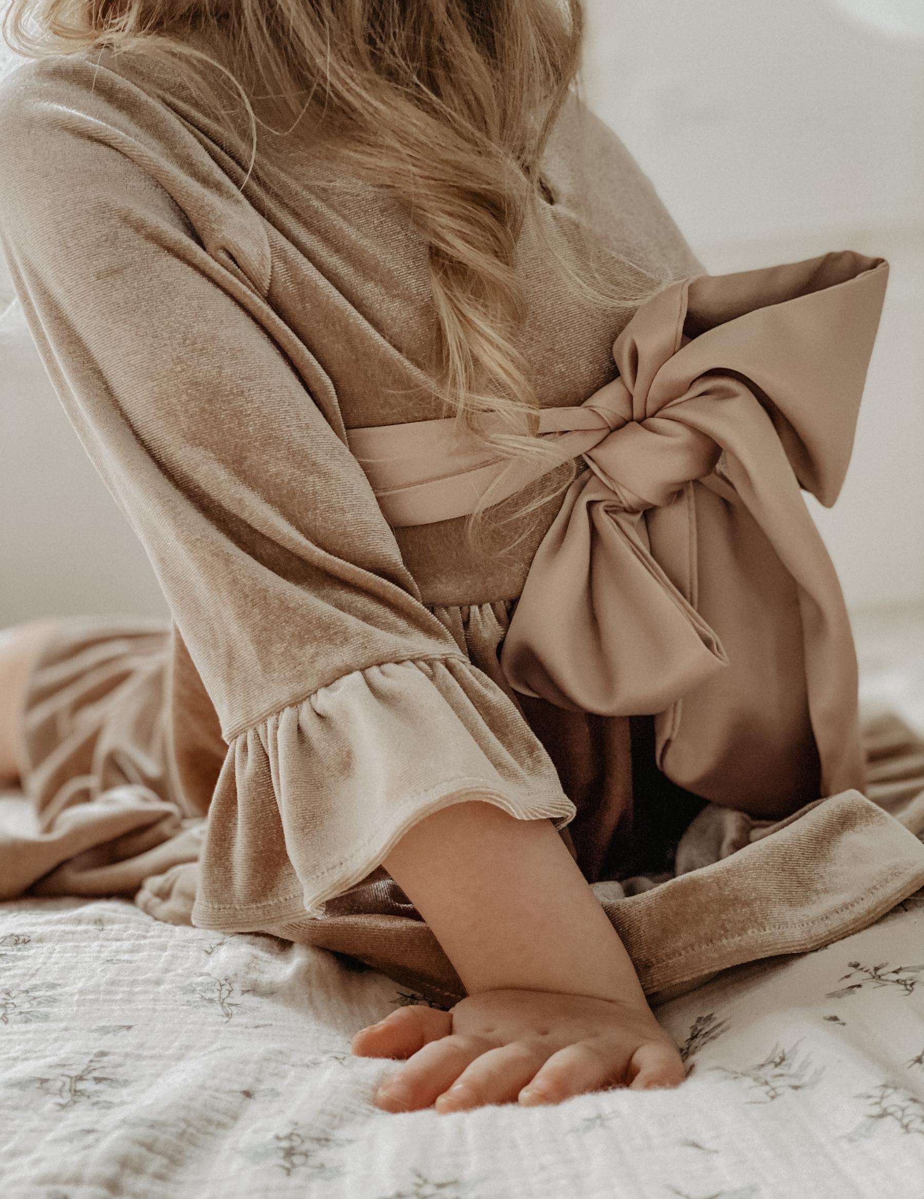 Made from ultra-soft velour that’s gentle on delicate skin, this dress combines luxury and comfort. The removable satin sash adds versatility, so you can style it up or down for any occasion.