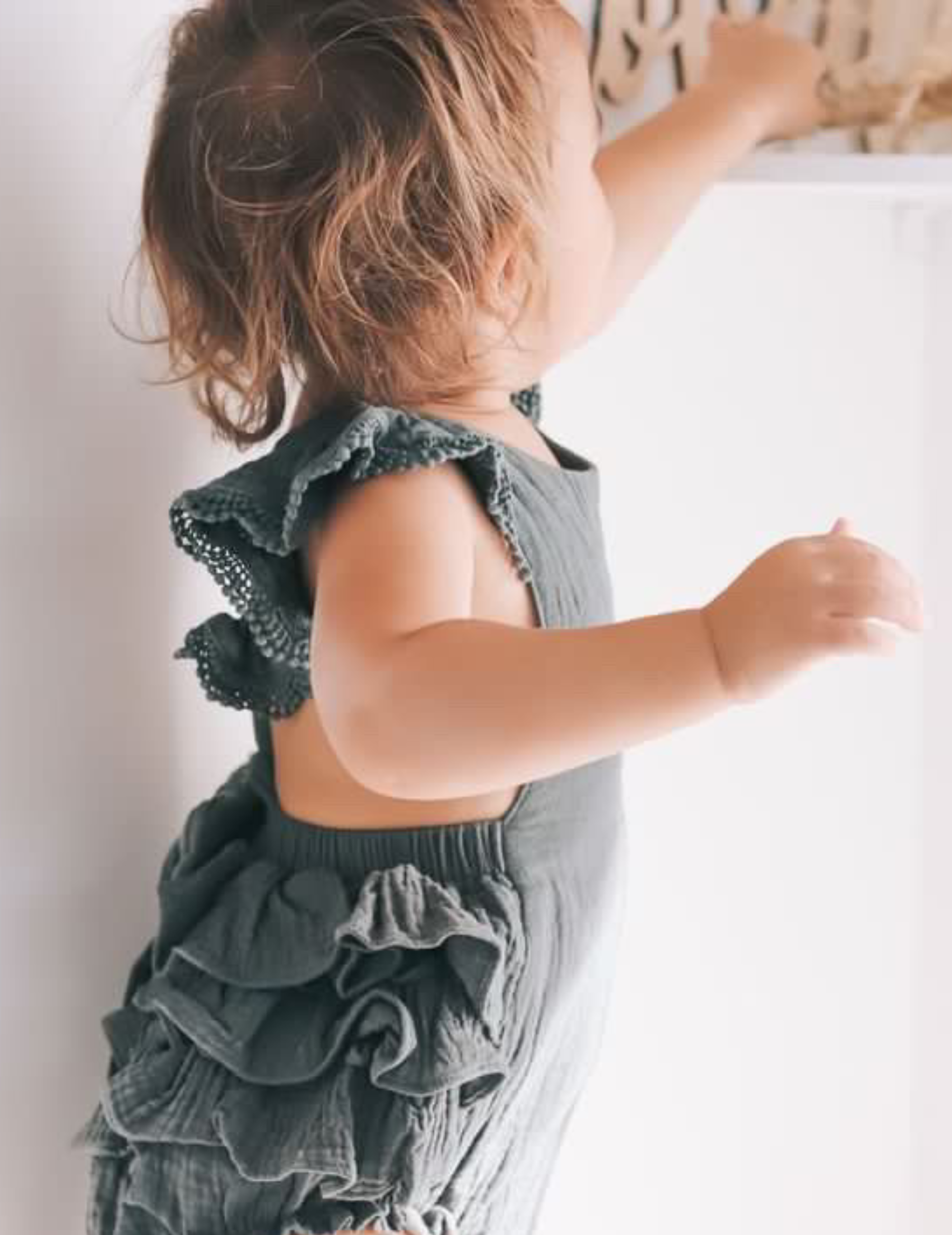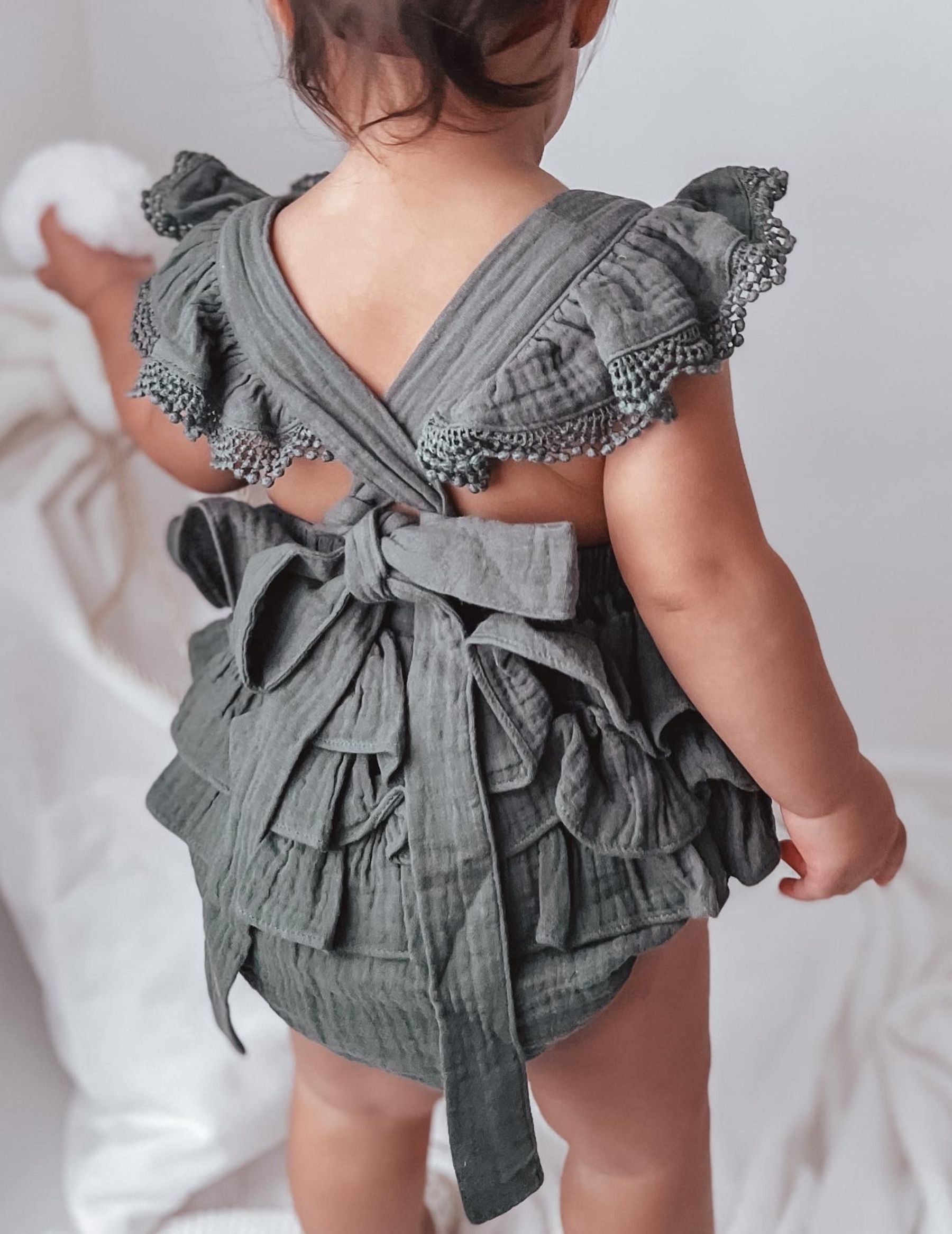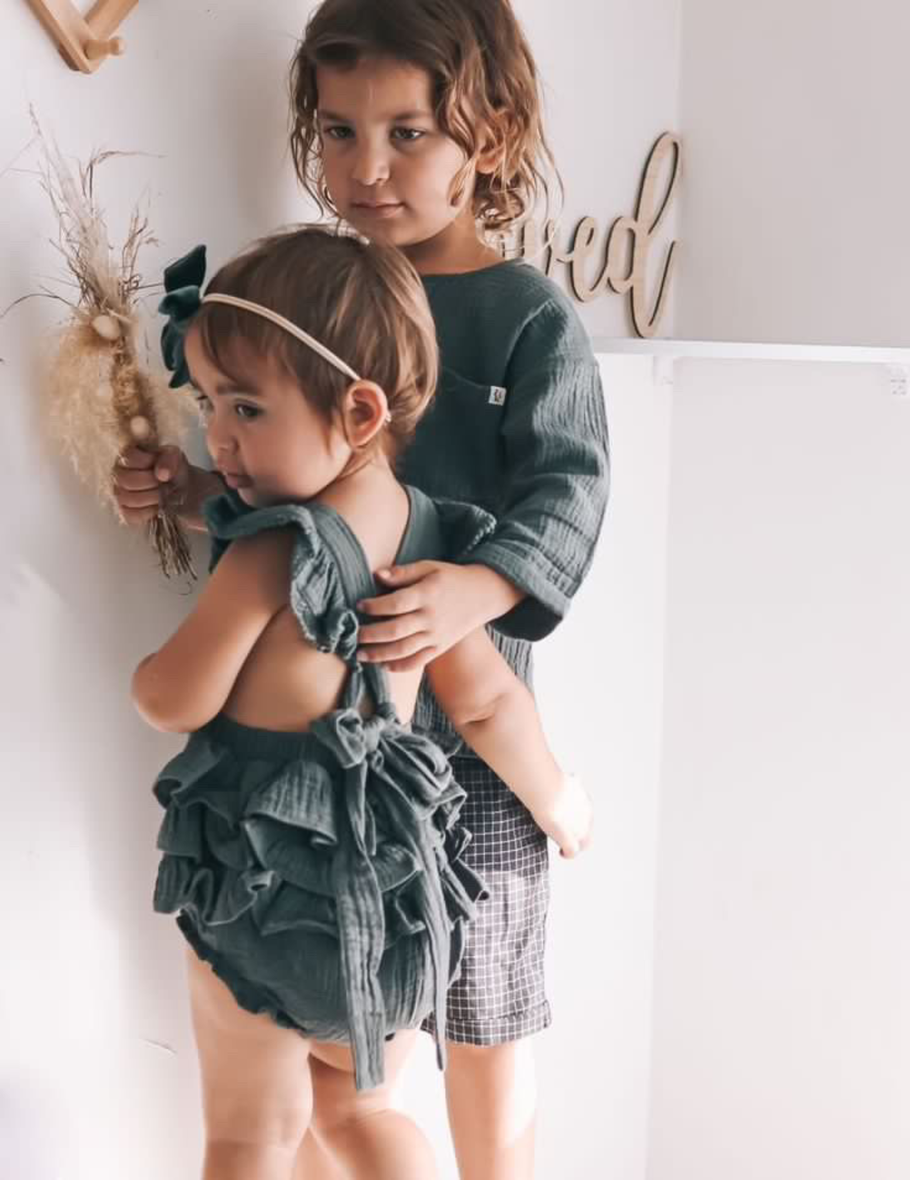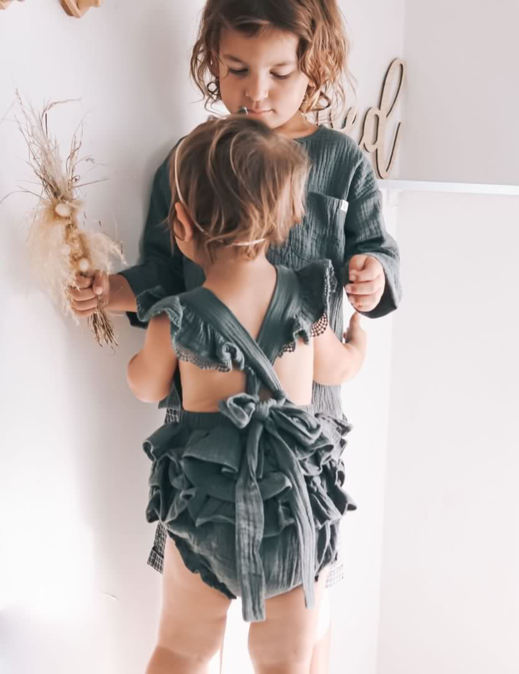 The adorable ruffle bottom Liliana playsuit in Dusty Pine is the sweetest little romper for your little girl's Christmas celebration.