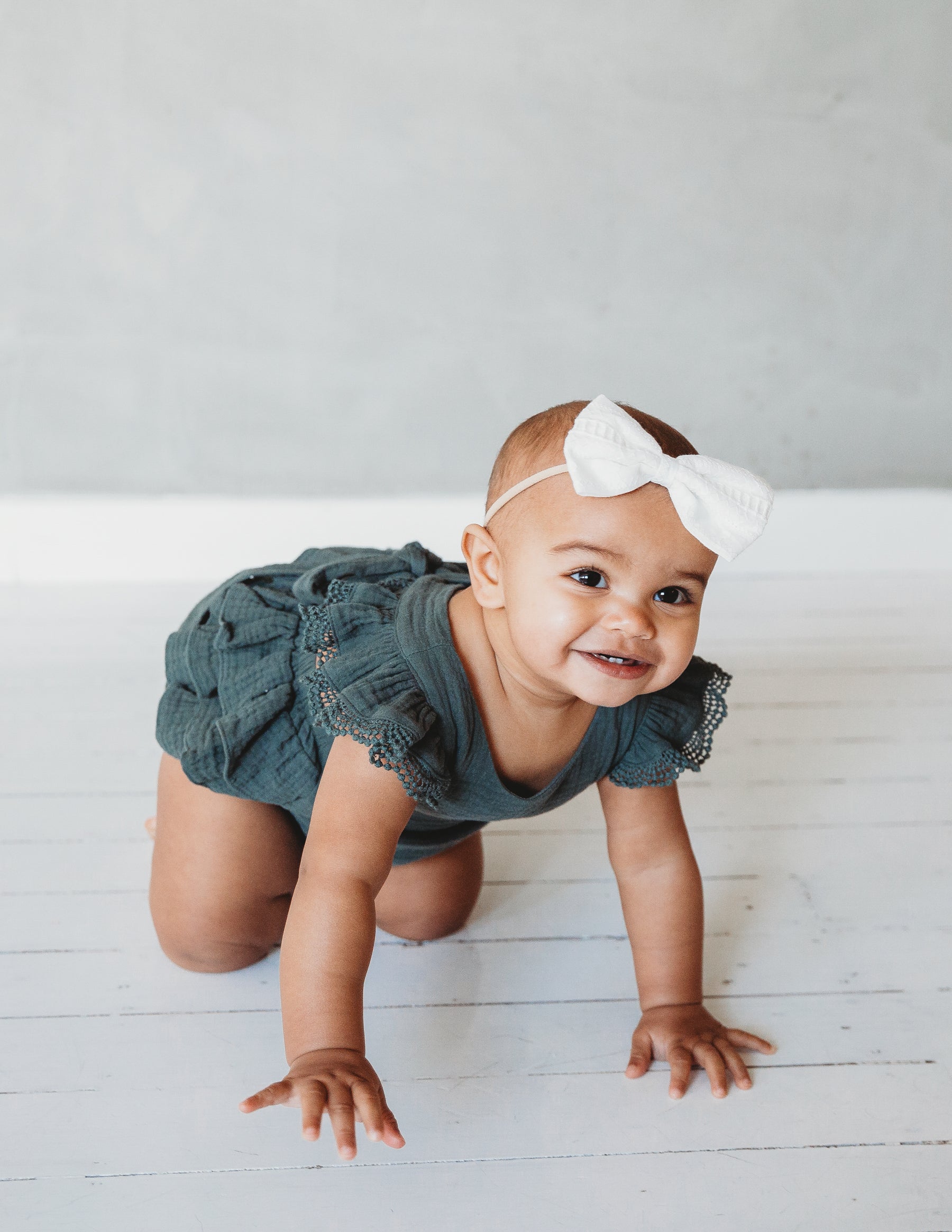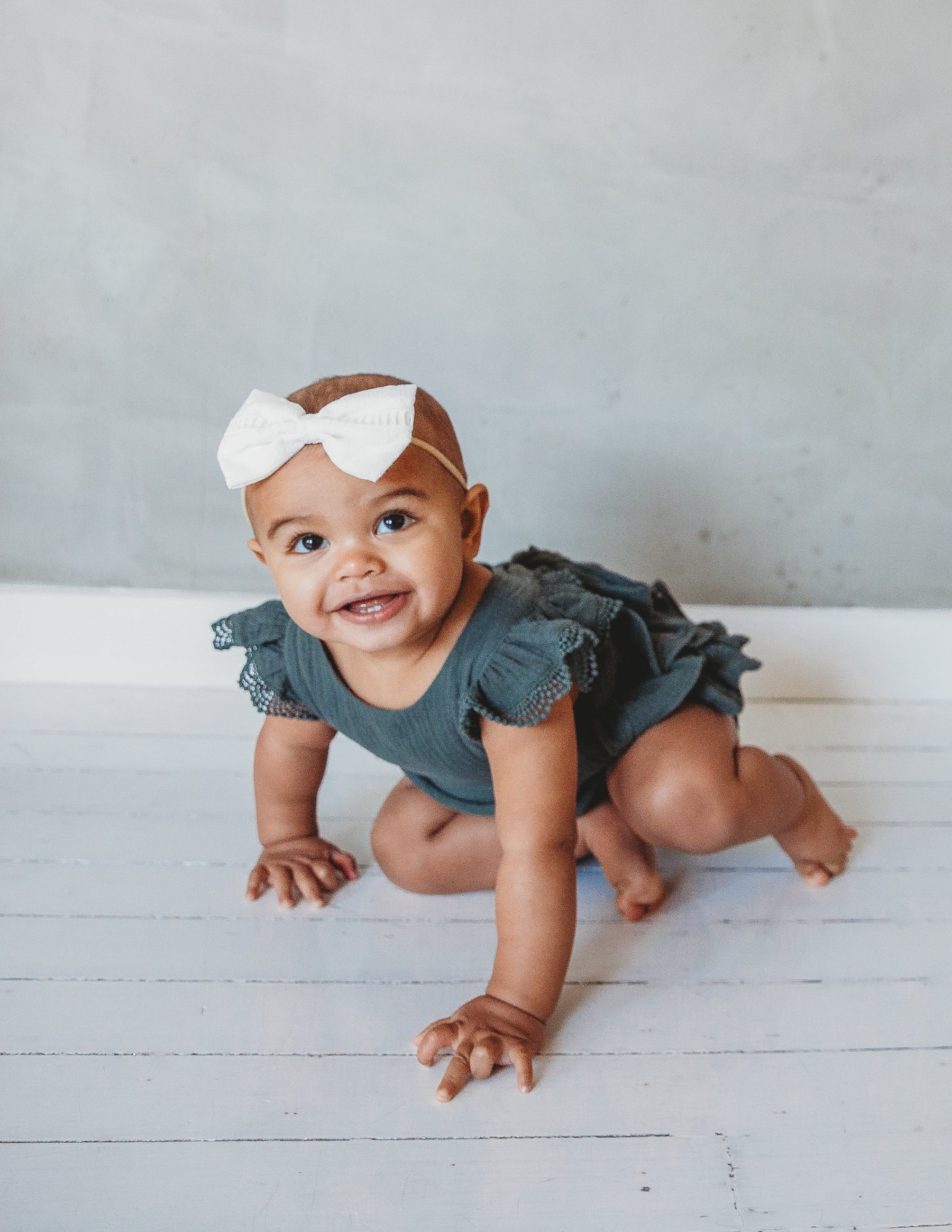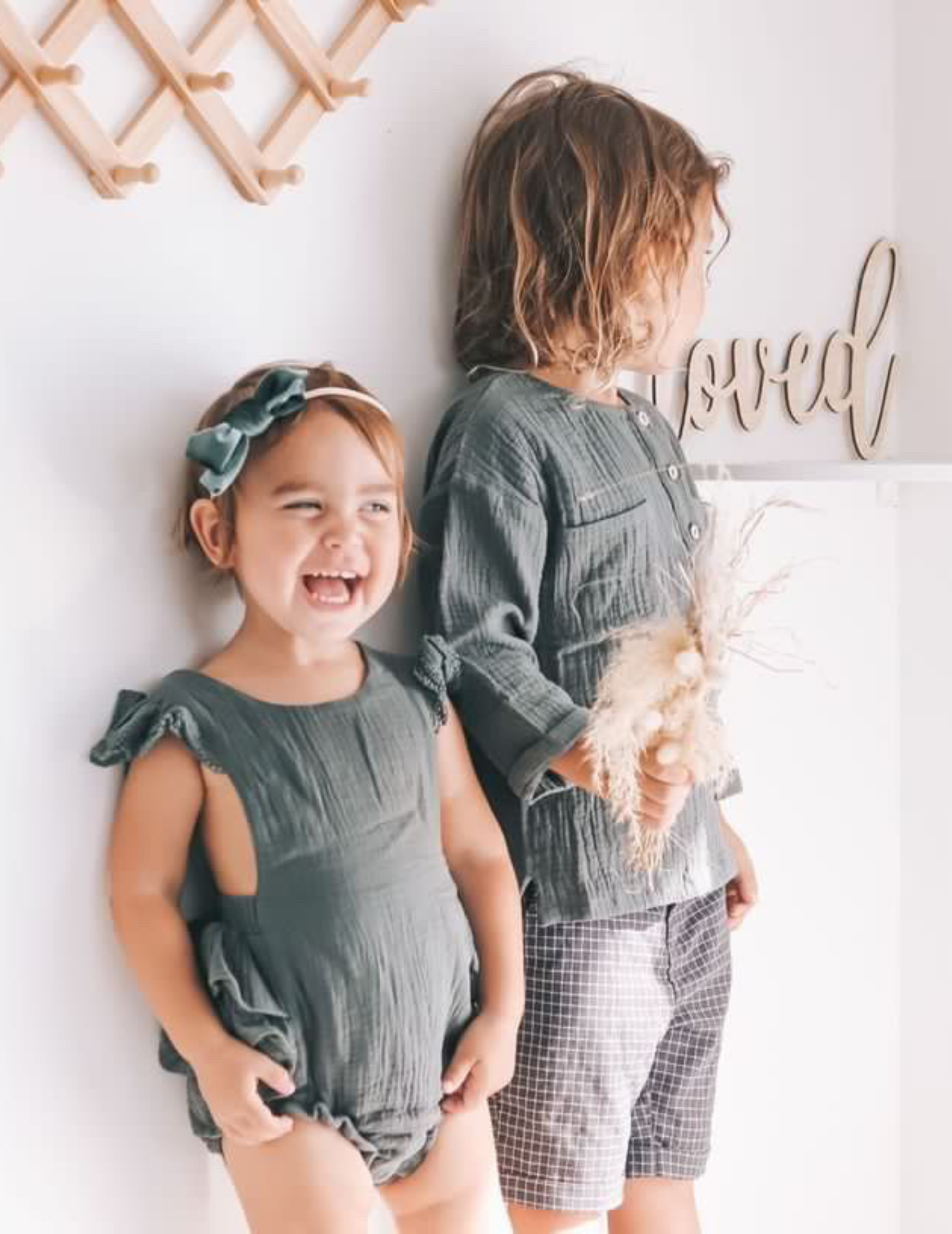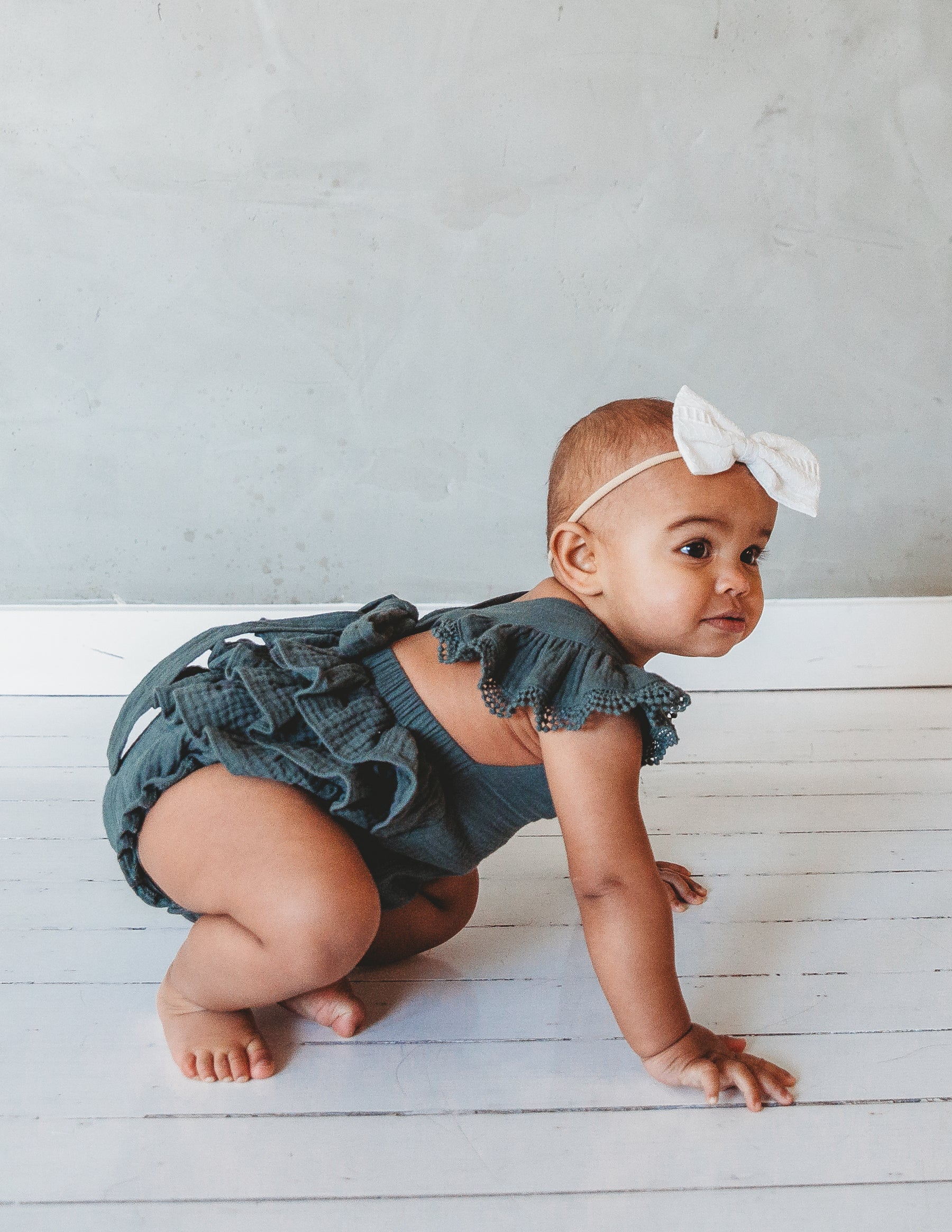 The adorable ruffle bottom Liliana playsuit in Dusty Pine is the sweetest little romper for your little girl's Christmas celebration.
