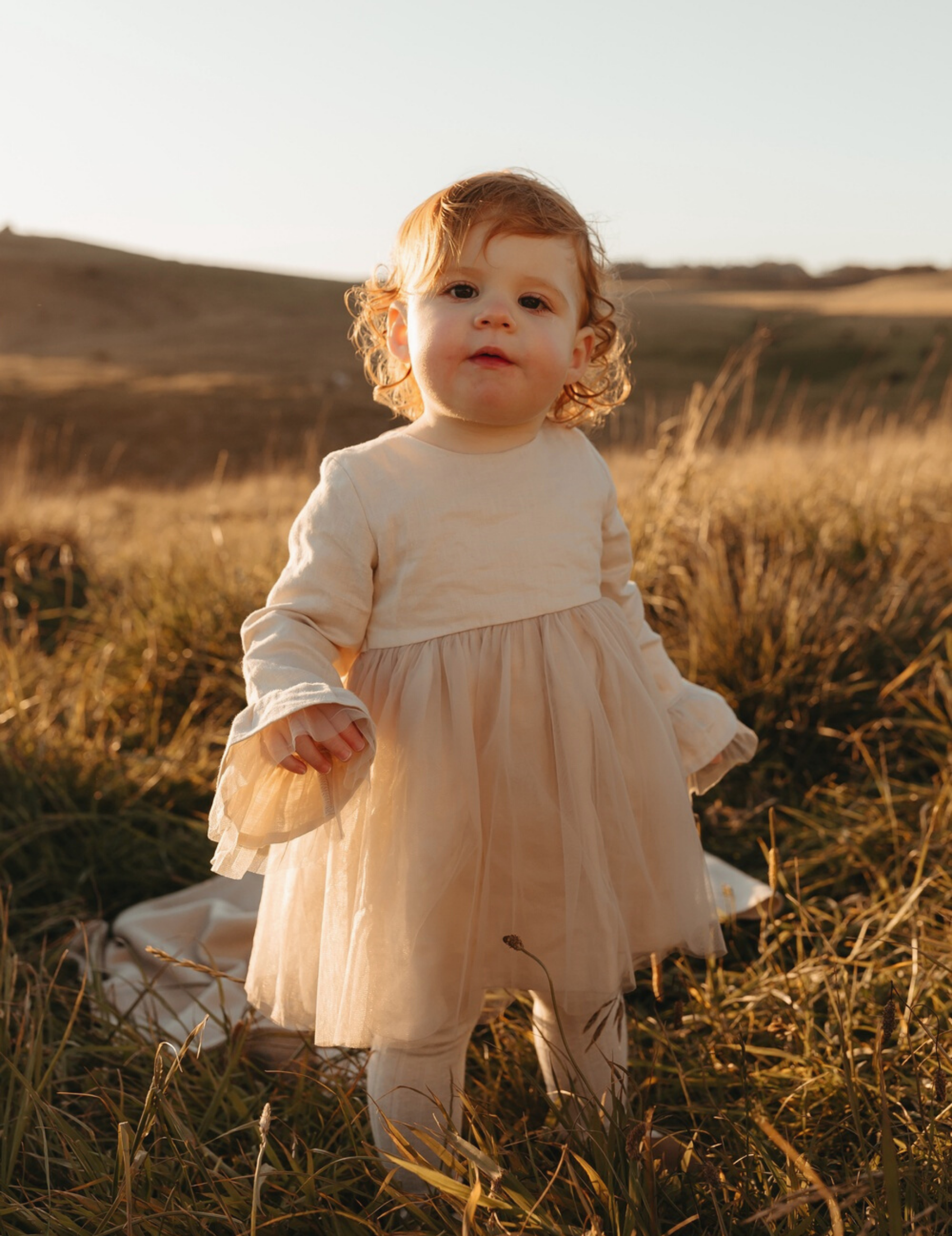 Features our classic signature linen and tulle combination, full sleeves with linen and tulle ruffles on the end. Slightly lifted waist, side zip for easy dressing and adorable organza ties at the back.