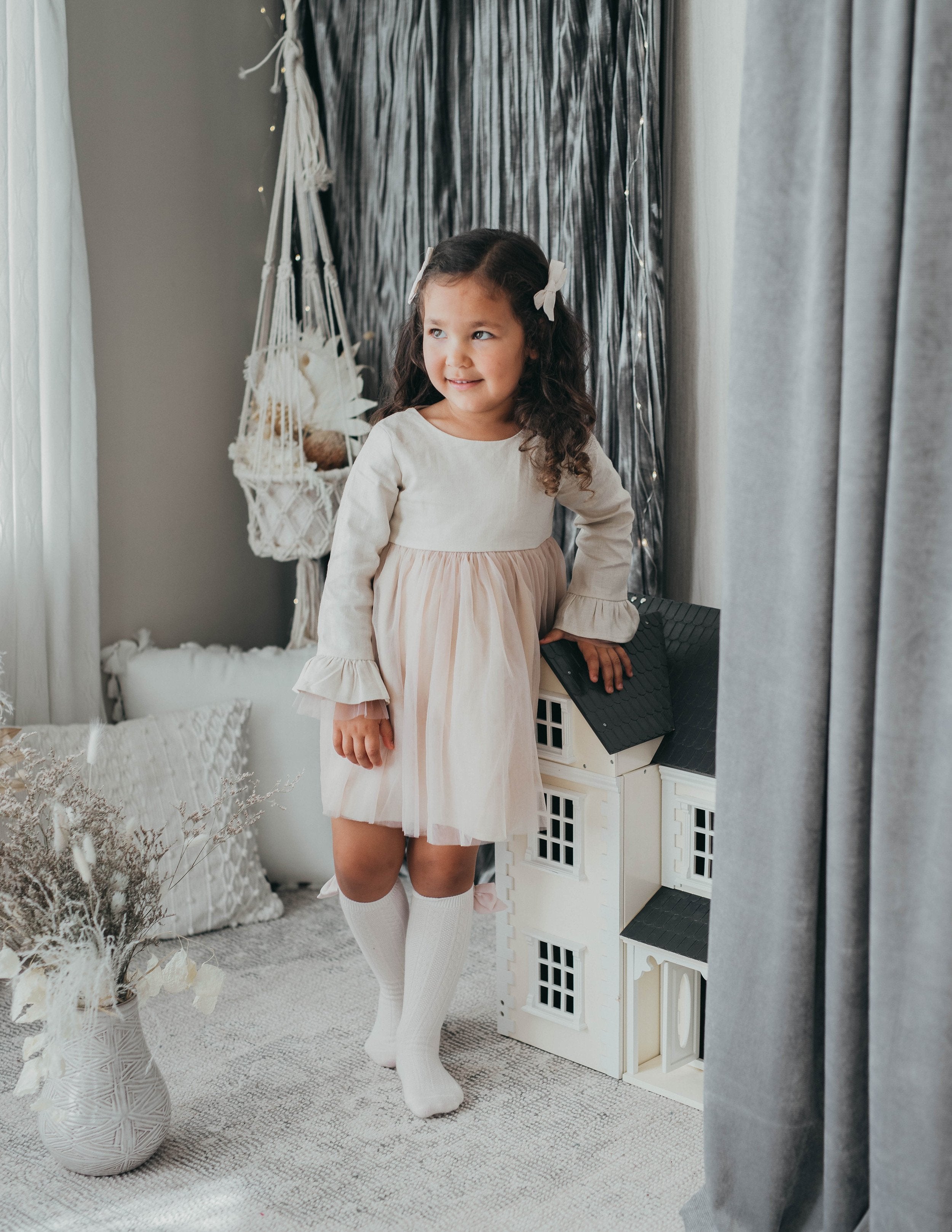 Every fairytale has a happily ever after and here is ours. Introducing our Ever After Linen Tutu Dress. Available in Light and pretty Ivory Blush and deep Plum. The perfect dress for special occasions, make your little girl feel like the royalty she is.
