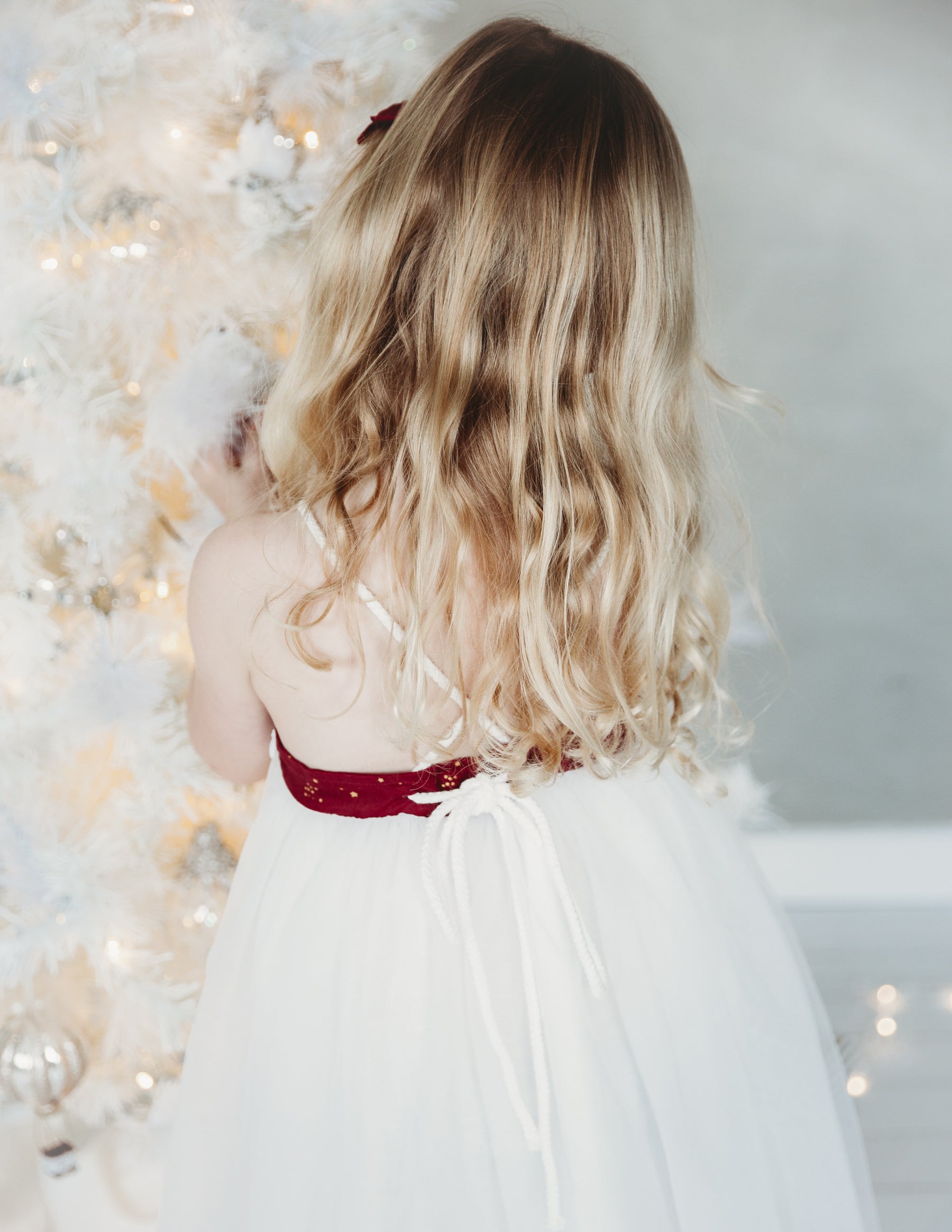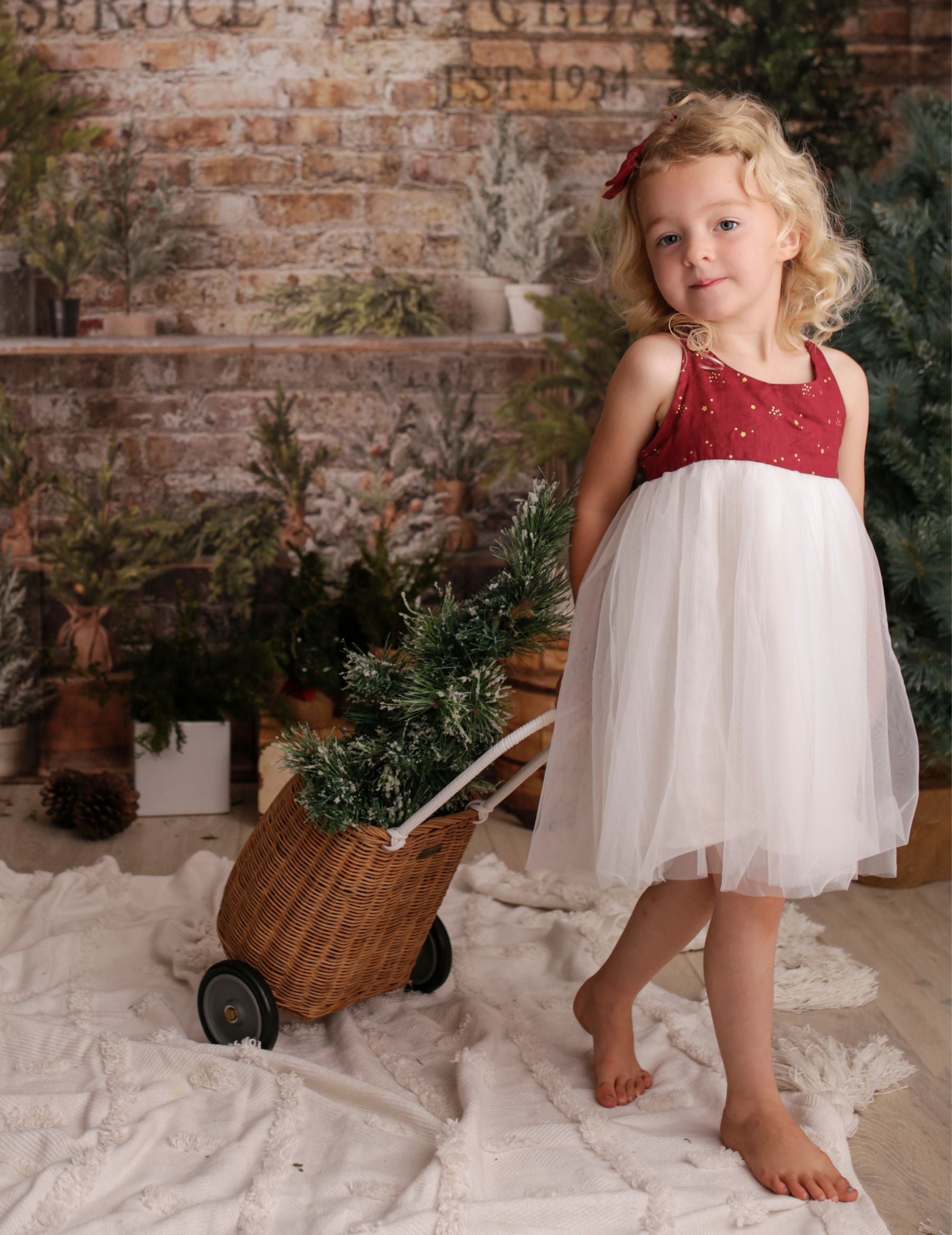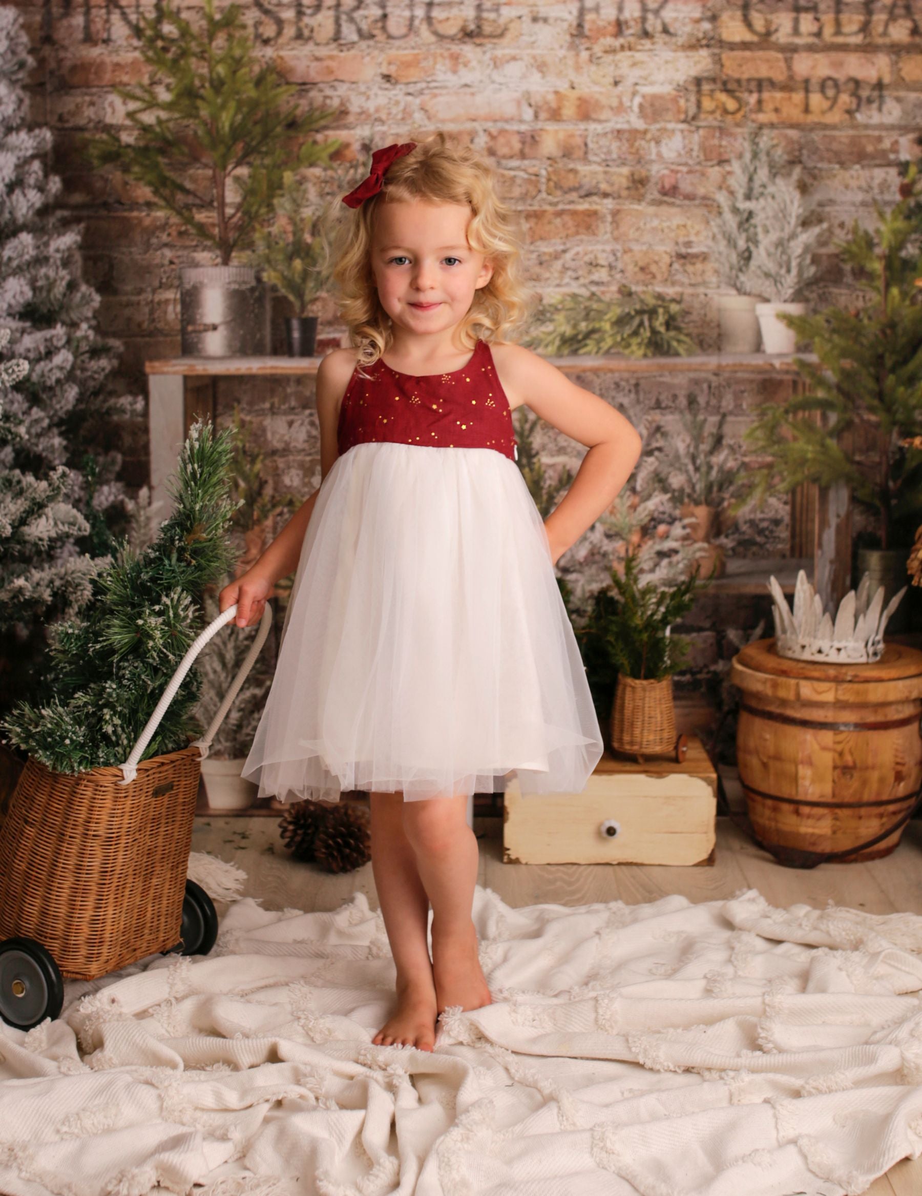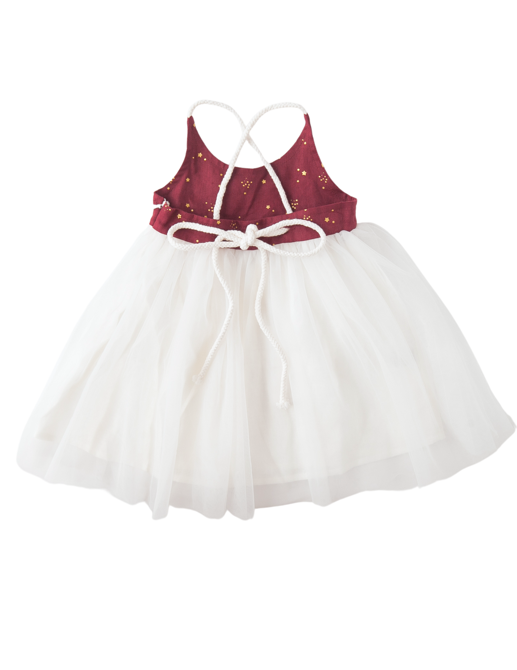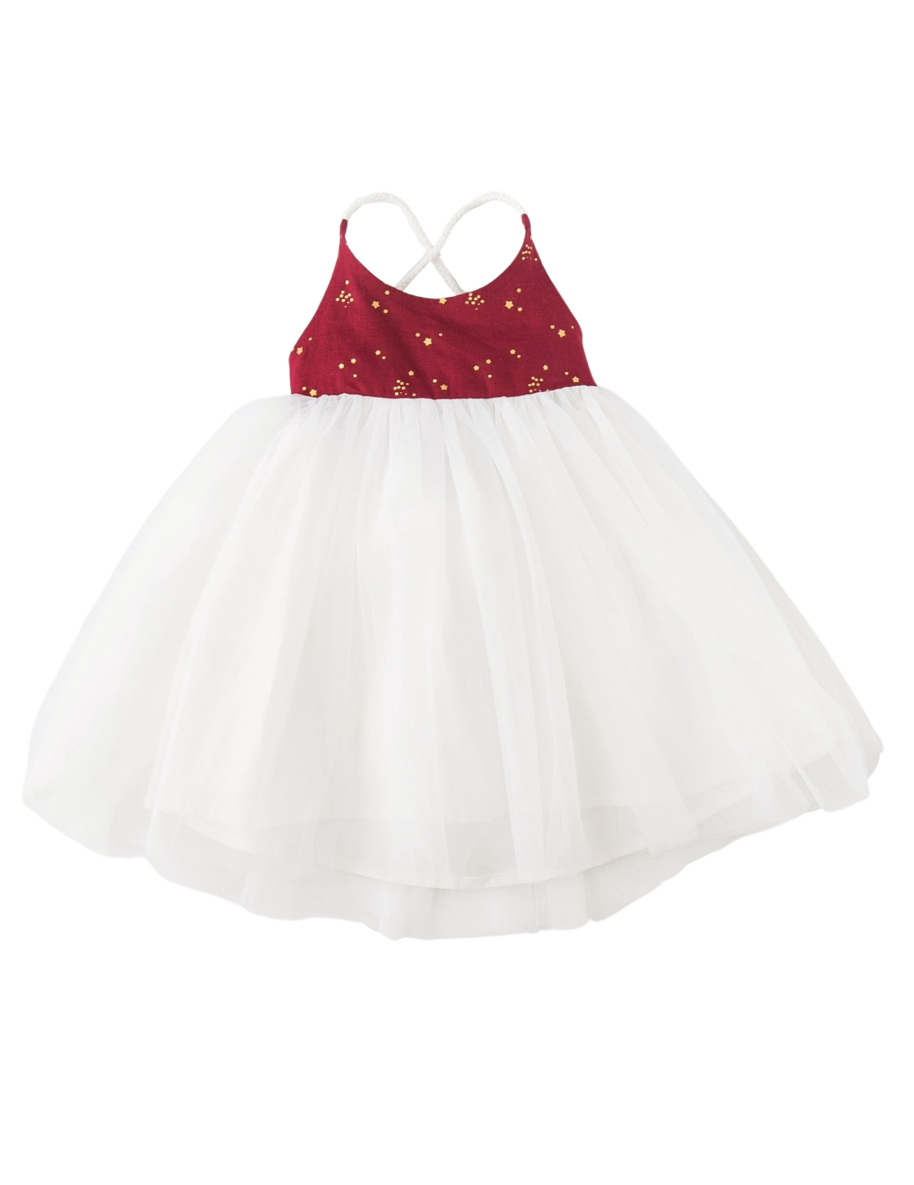 The dress features a beautiful open back with tie details at the back. The linen will keep your little darling cool all summer long. And best of all, the Red and Golden Stars make it the perfect Christmas Day Dress.