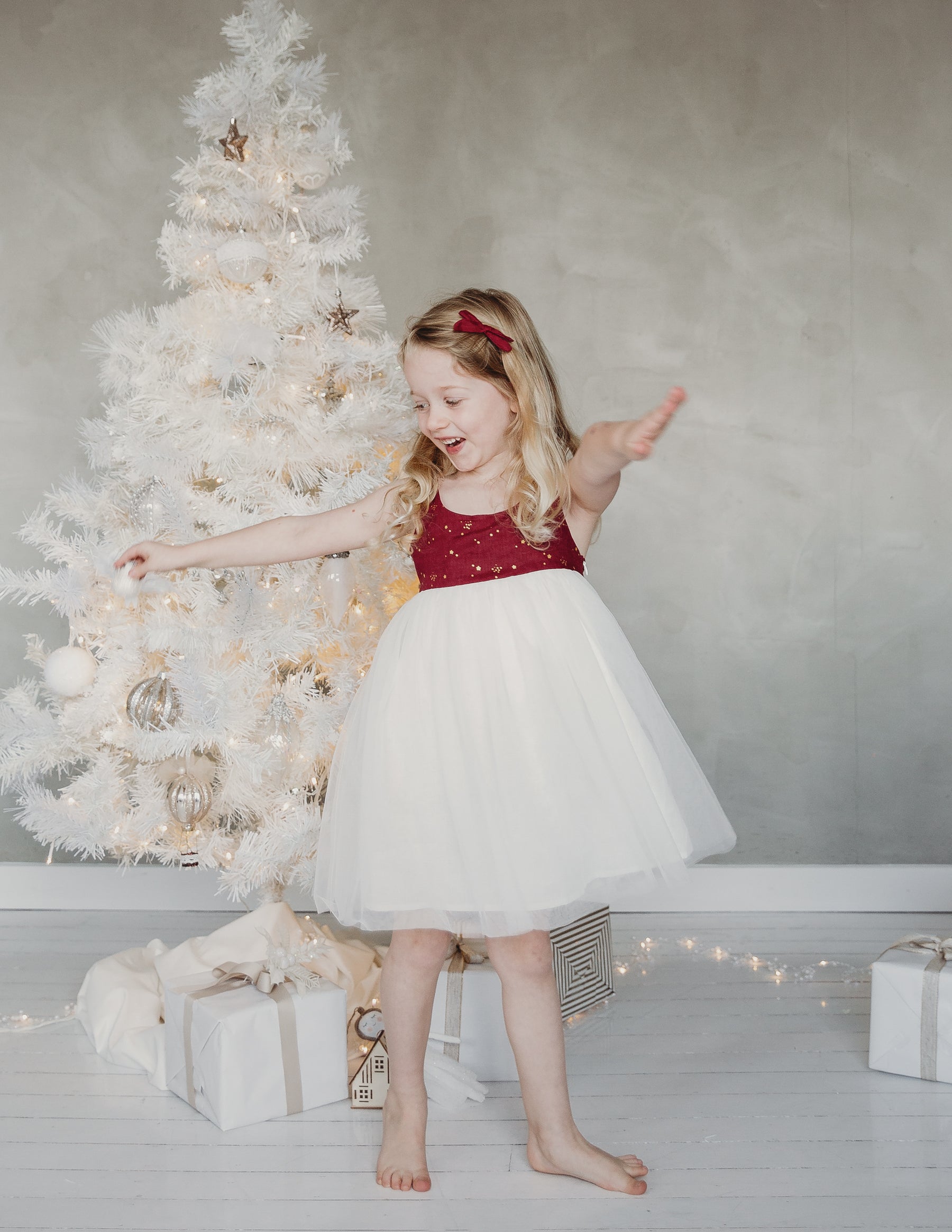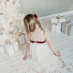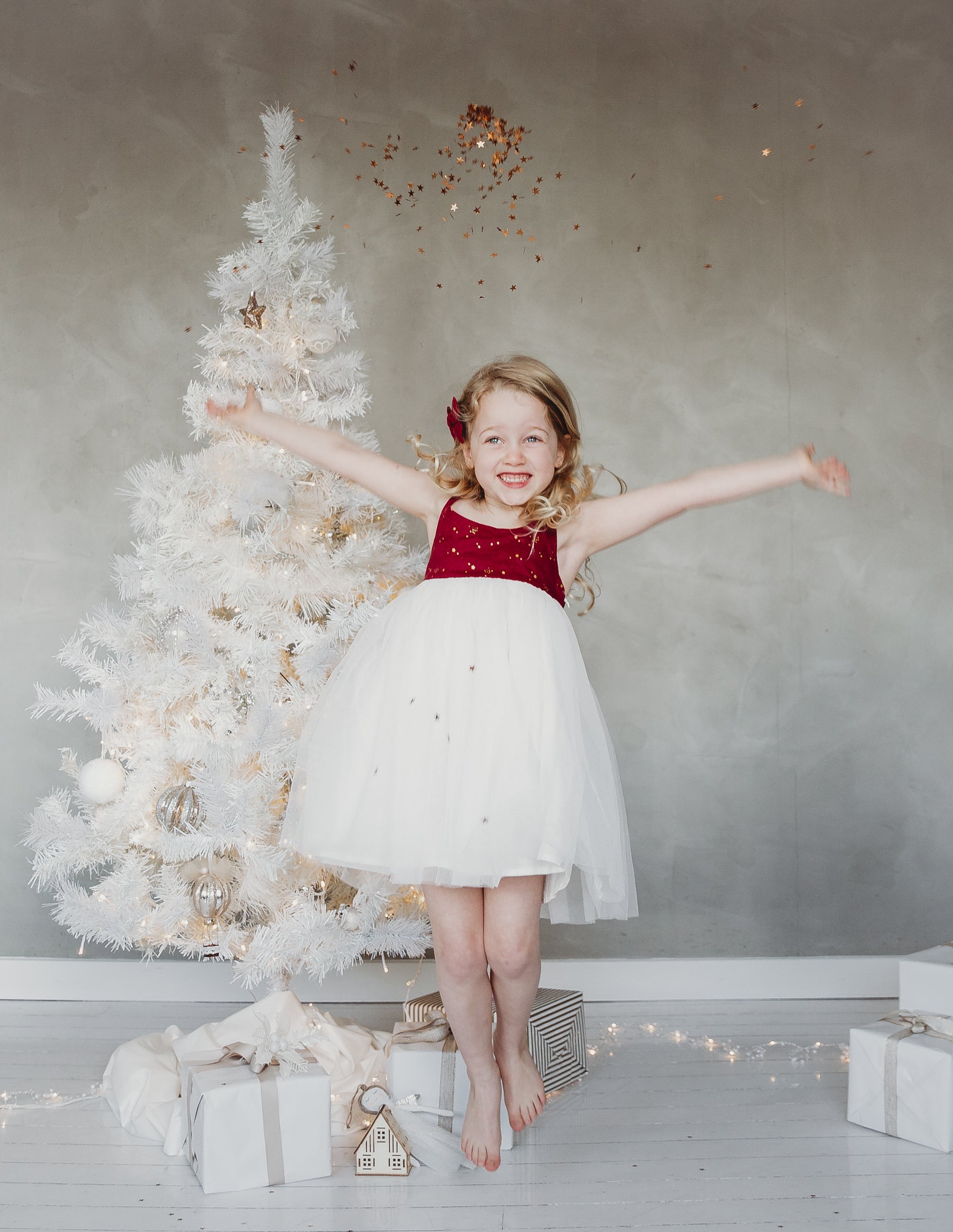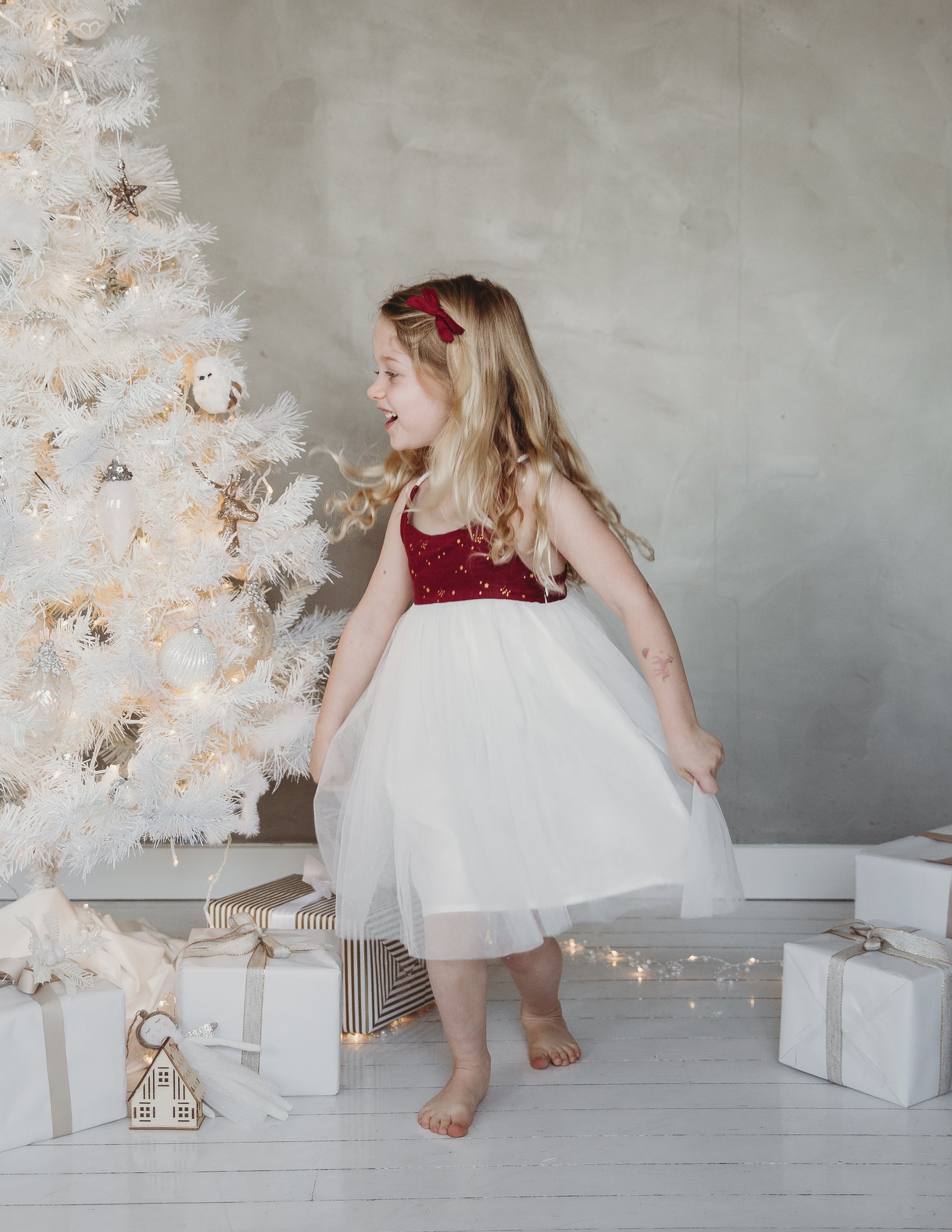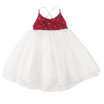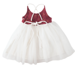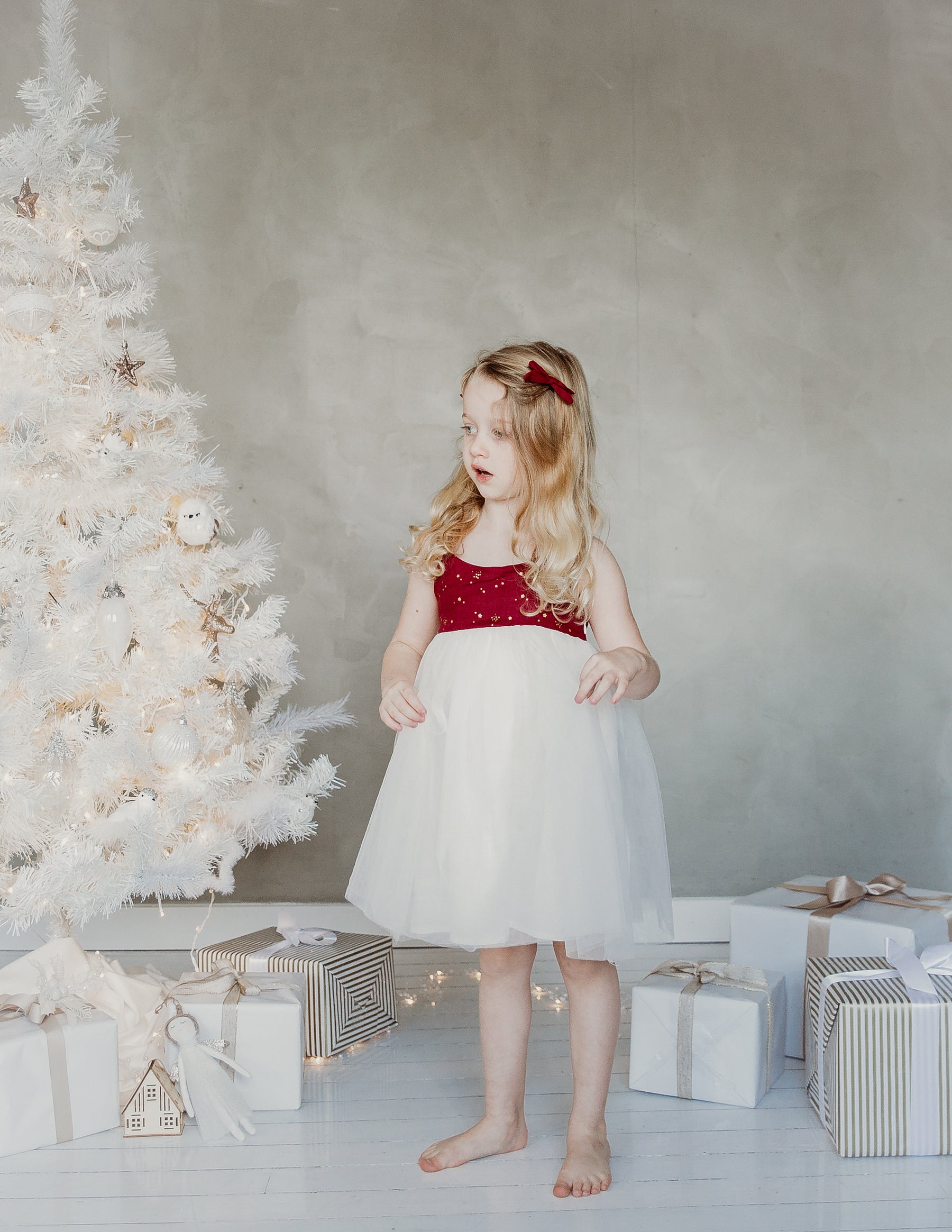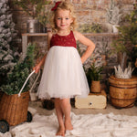 The dress features a beautiful open back with tie details at the back. The linen will keep your little darling cool all summer long. And best of all, the Red and Golden Stars make it the perfect Christmas Day Dress.